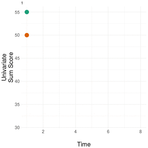 The diagram on the left panel shows the trajectory in the plane. The graph on the right shows the same two patients collapsing the two-dimensional (2D) trajectory to a univariate (1D) aggregate measure - in this example, by simply summing the positive and negative domain scores. Notice that even though the two trajectories diverge in their native 2D space (at around the third time point), the univariate (1D) measure assigns them practically the same value, most notably at the final time point.